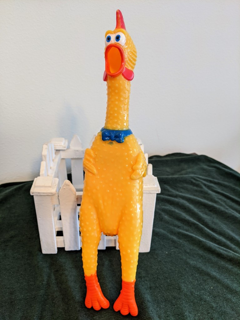 This squawking rubber chicken won a blue ribbon at the barnyard games for its shrill yell! It’s a soft vinyl 13″ chicken that squeals and squawks with every squeeze. Guaranteed attention getter; we irritated everyone in our office when we were testing it. Now, you can irritate everyone in your life, just like you’ve always dreamed.