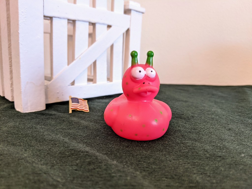 I have hair as eyes and pink dots all over. I come from Planet Ducky! We have a rainbow sun and a rainbow sunset. But back to earth… where the sky is blue and the sunset is pink. I live in an underwater cave and eat fresh fish like sushi and lox. Oh, and if you are wondering how I got to earth, I will tell you. So, I was on my way home from shopping on Mars in my flying saucer when a big, fast space rock slammed into my saucer! My engine broke and I landed on Earth. The next thing I knew, some kid named Izzy was taking my picture. And here I am on the Internet! The End.