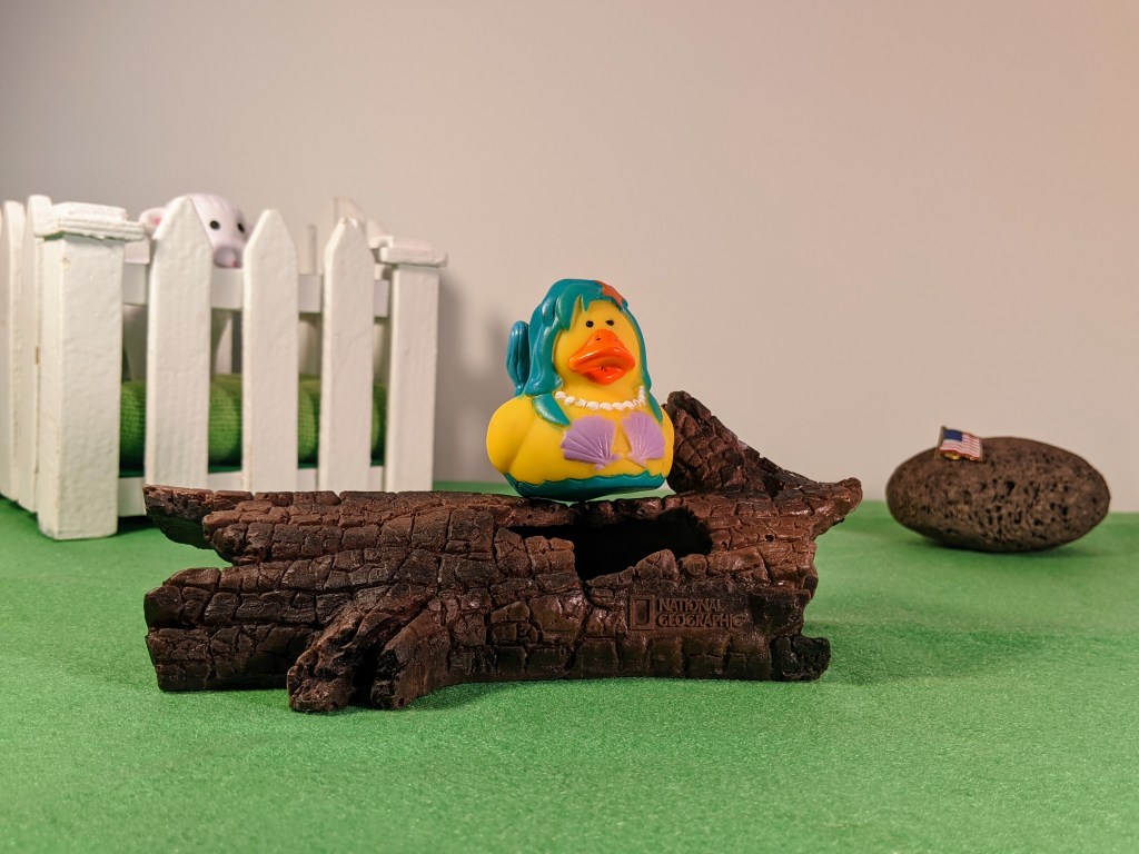 Hello! I’m Mer Duck. I am a mermaid ducky. I wear a swimsuit made of shells. I have a silly mermaid tail and with matching blue hair. I have a white pearl necklace that was a gift from an oyster friend of mine. The starfish in my hair is also a good friend who like to visit with me sometimes.